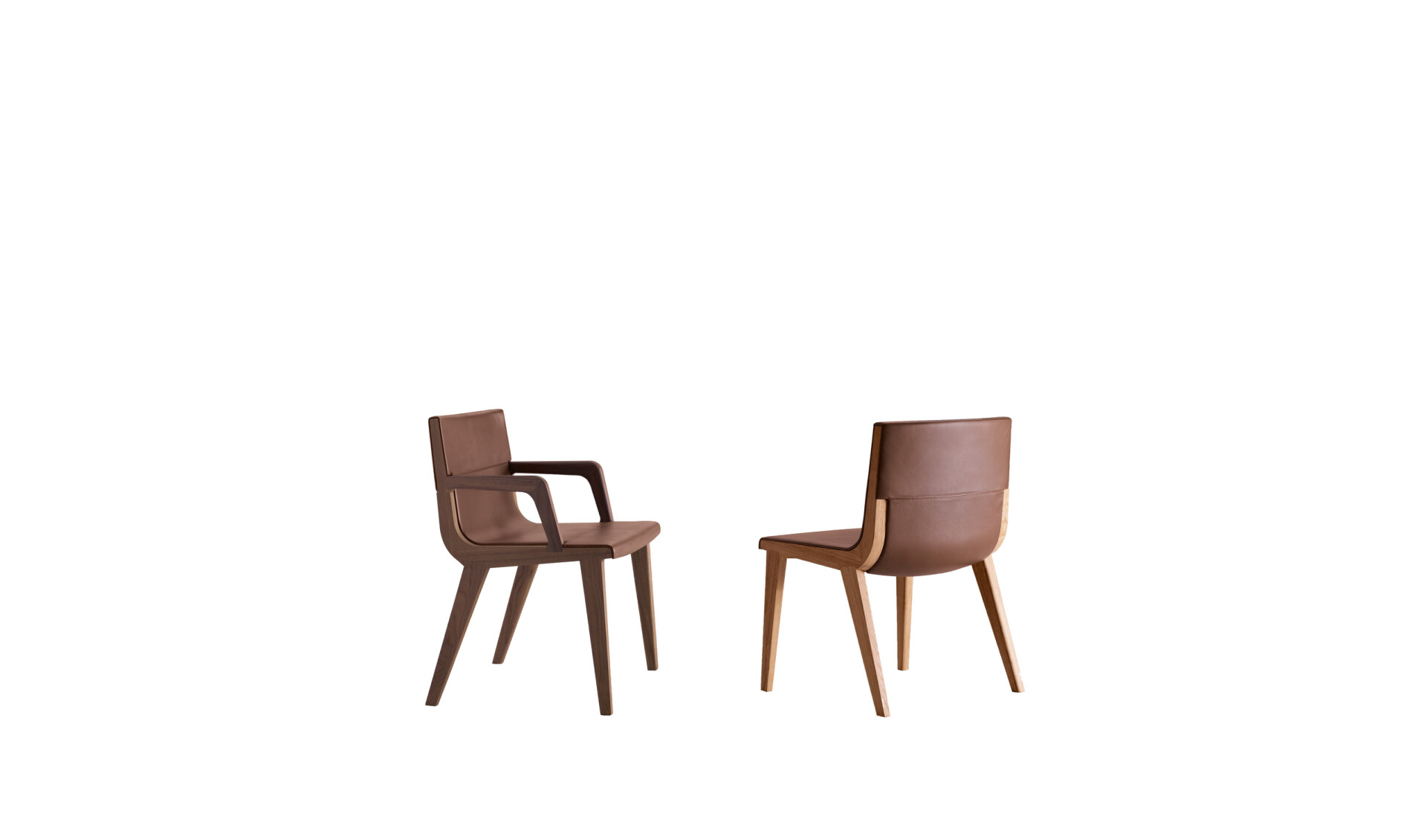 The Acanto chairs, with or without armrests, have solid wood frames that support comfortable seats covered in fabric or leather; another version, with the same structural characteristics, is designed to be a conversation chair.