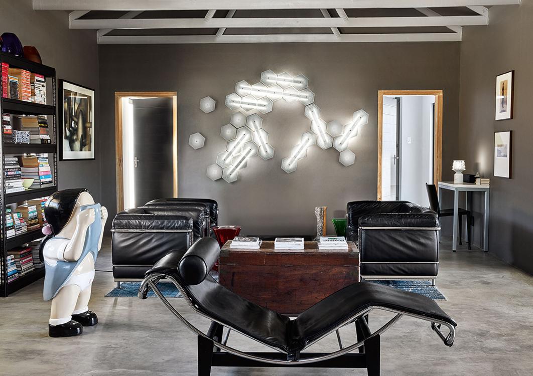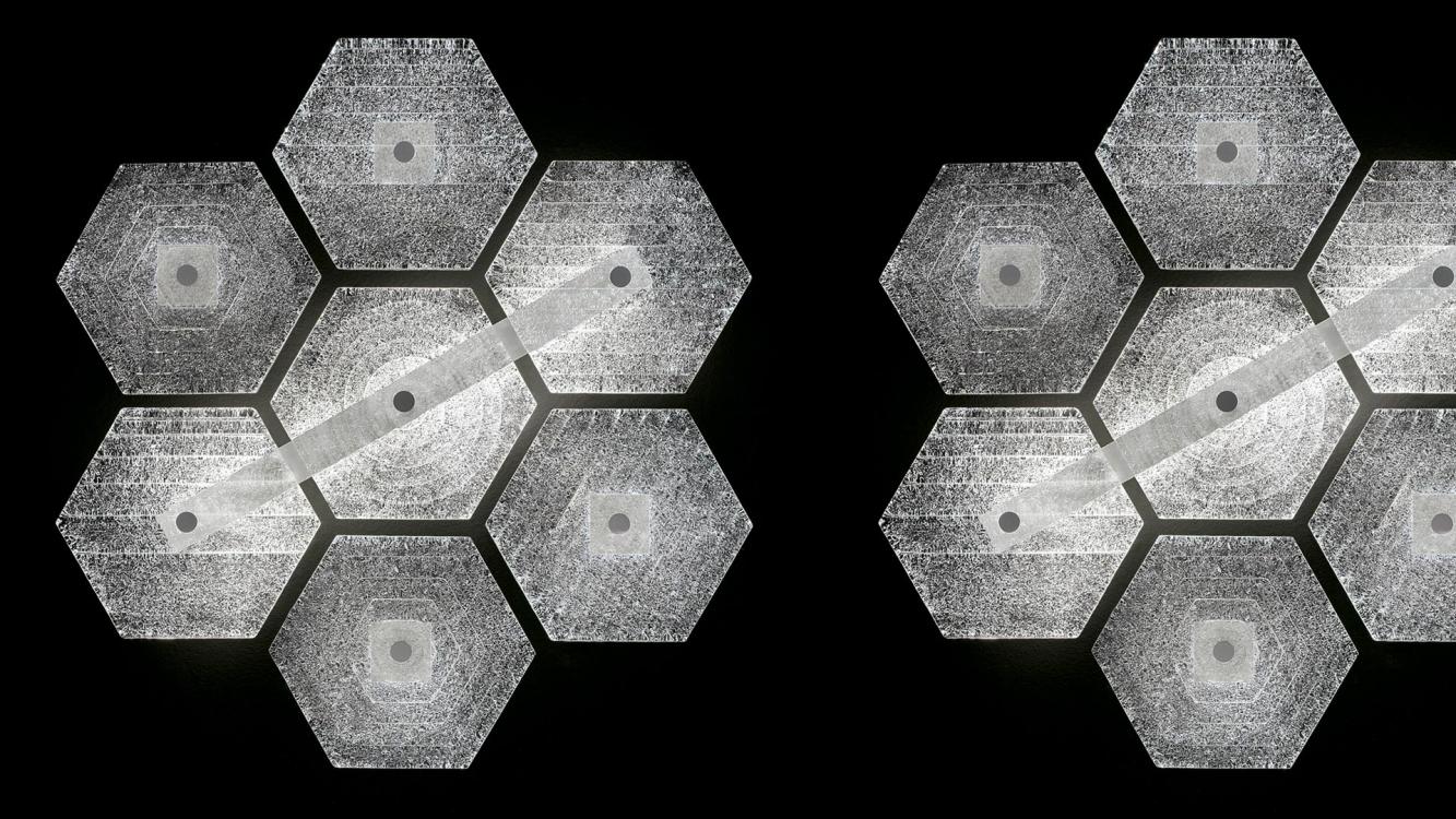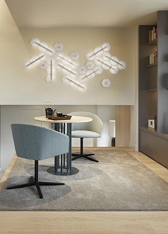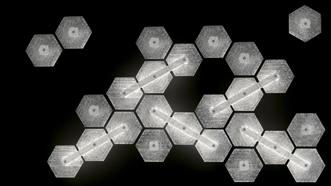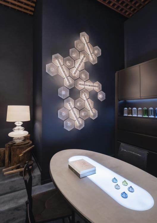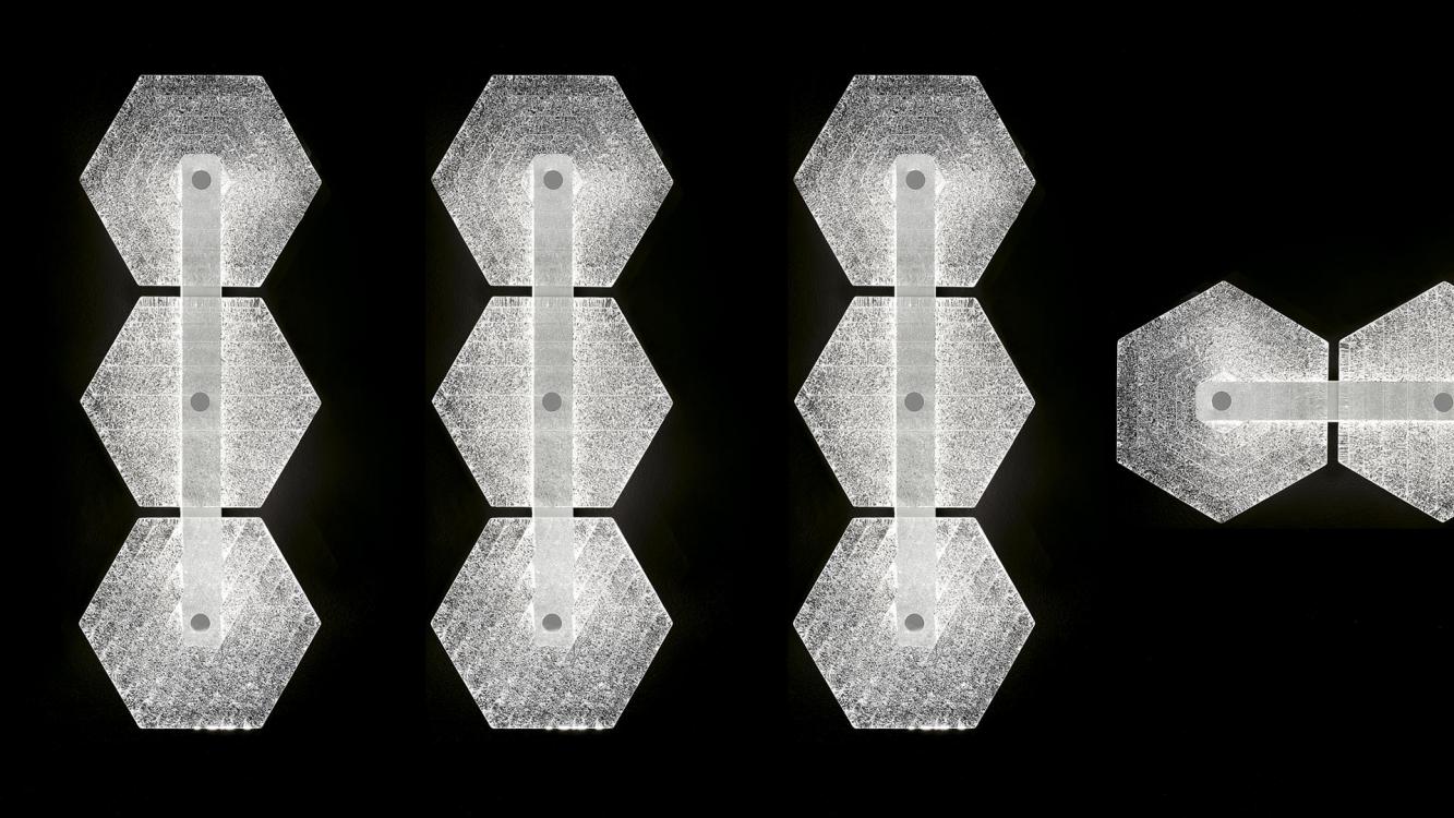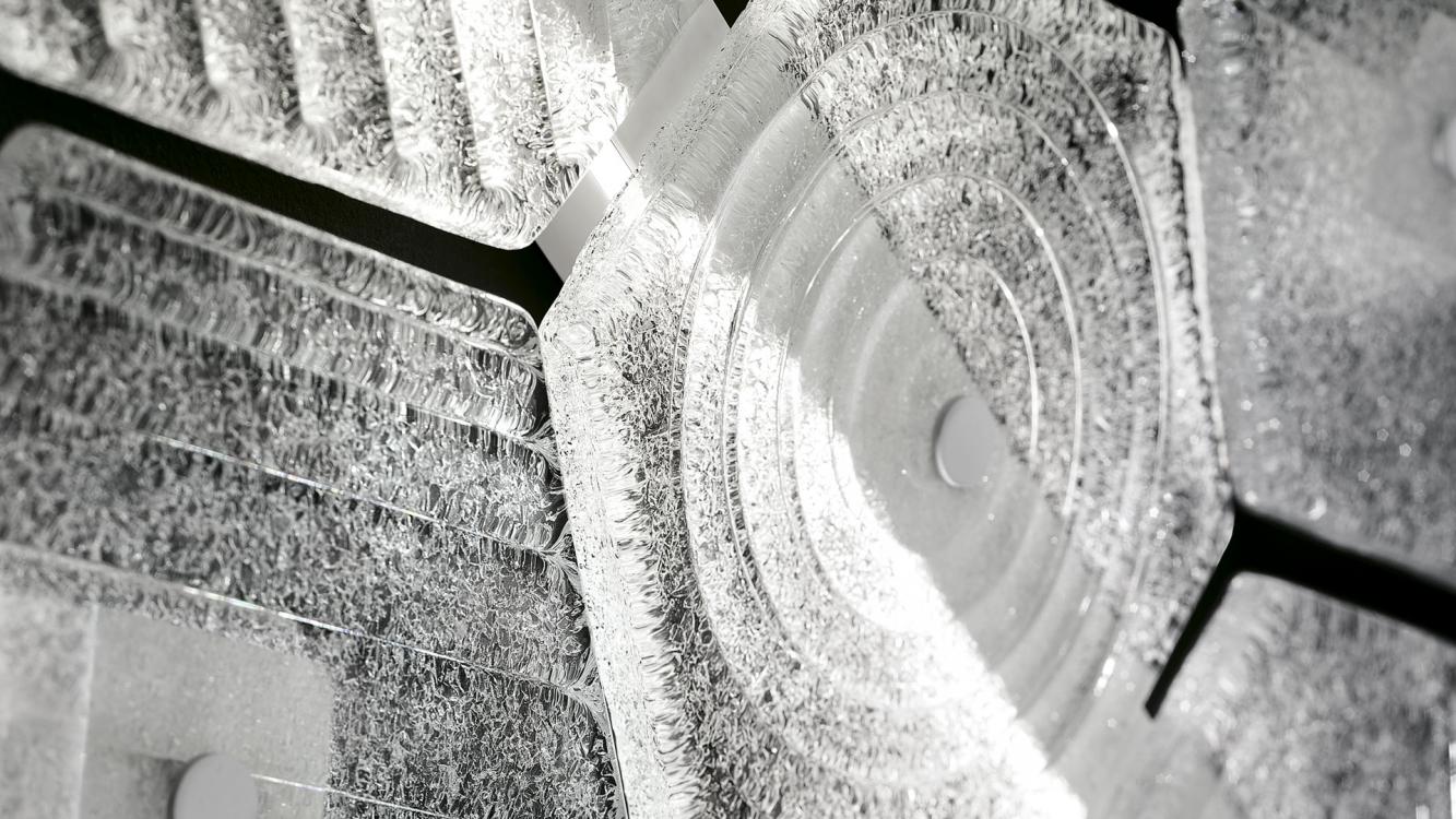 The greatest strength of Marrakech, apart from its ability to be used either as a ceiling or wall lamp, is its limitless configuration potential: the regular hexagonal tiles allow endless additions of the Venetian crystal elements which distinguish the collection, with their different surface designs (up to three versions). The “rugiada” effect applied to the back of each element, a technique patented by Barovier&Toso in the 20th century, diffuses the light supplied by the low voltage led strips housed in the metallic support structure.