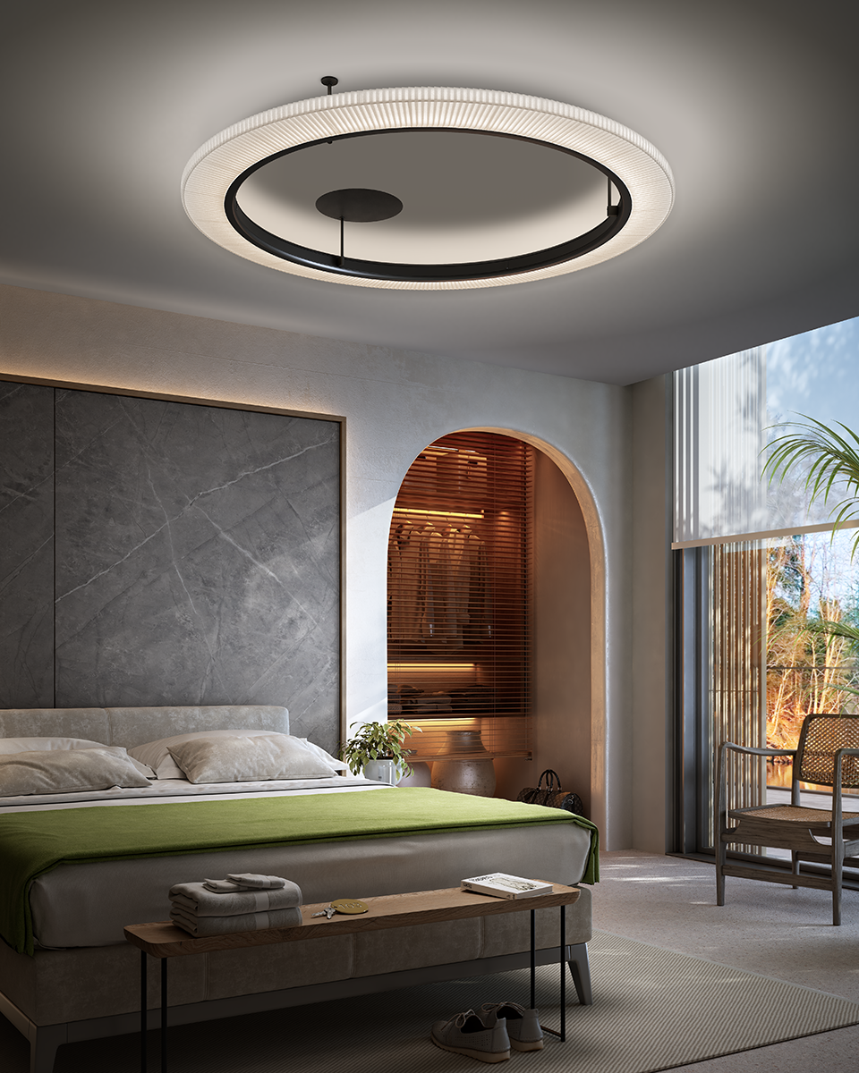 The Roda Collection is characterized by its large, cylindrical, ring-shaped shade. Its inner contour is surrounded by an aluminum ring housing a continuous circle of LEDs, emitting a uniform, filtered light. The warmth of the ribbon is highlighted by the dark ring outlining the perimeter, making these fixtures particularly cozy and lightweight, because despite their large volume, they seem weightless. The Roda pendant lamp comes in a range of sizes and versions. Depending on the model, they can be hung horizontally or vertically, and different compositions can be created in the same environment. User can customize the canopy painting its cover plate.